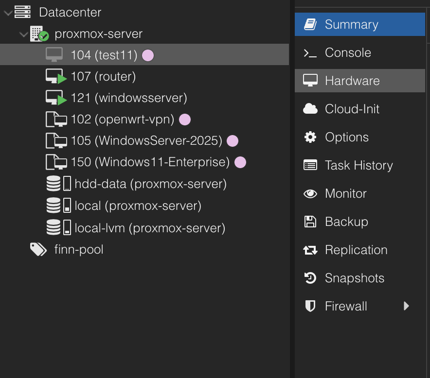 - After this is complete, find the new virtual machine you created. And open the hardware section as shown below.