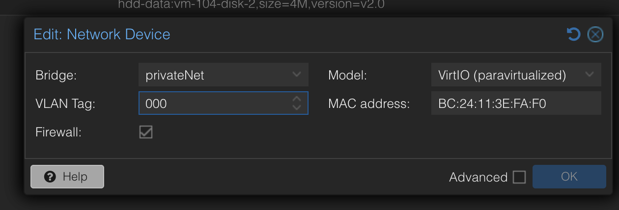 - Change the VLAN Tag to the VM-ID of your virtual router. In my case, as we can see in the picture above, i would put in a VM-ID of 107.